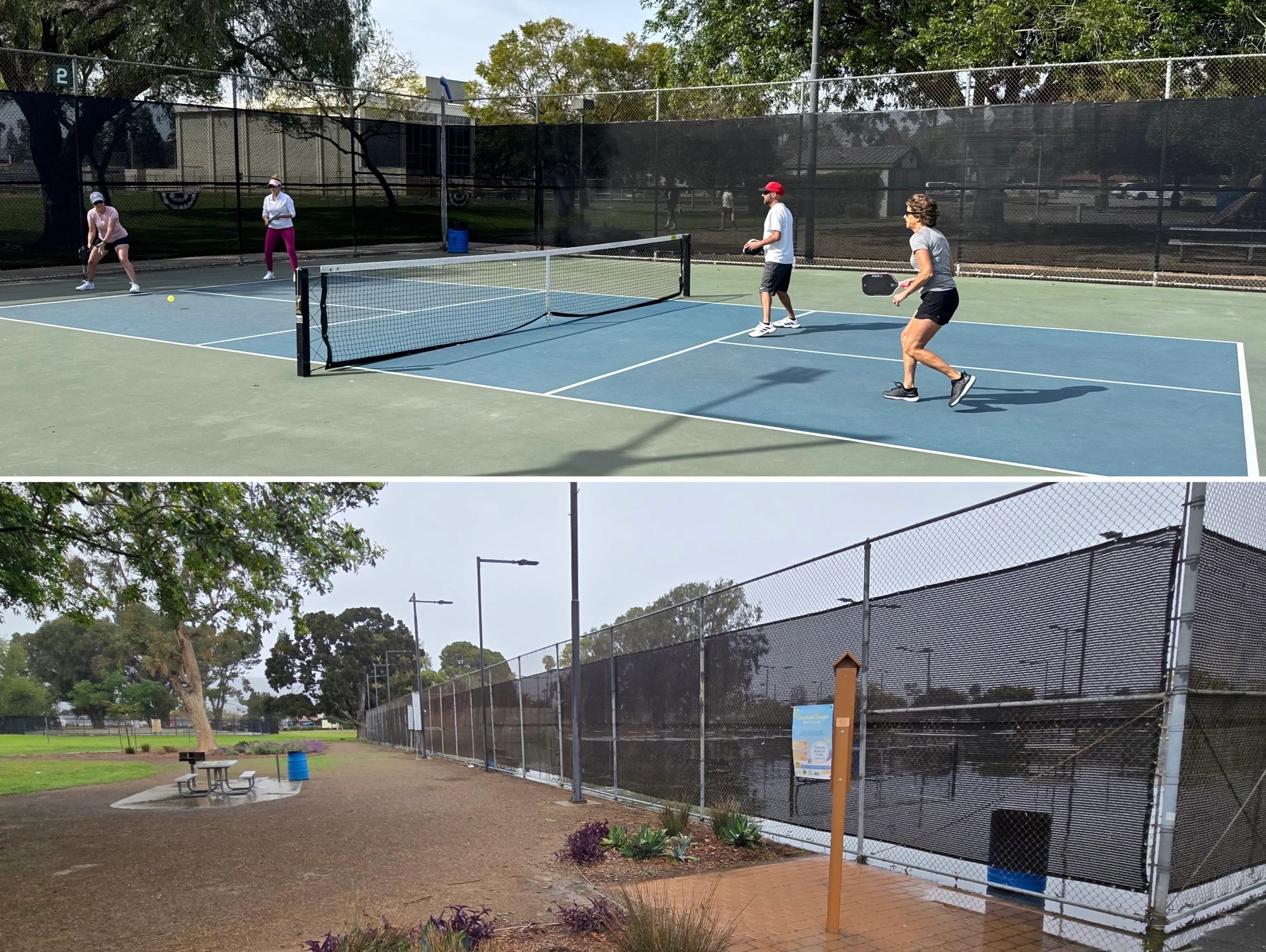 Four dual use courts with roll away nets. First come, first served. There is now a paddle saddle. Pickleball players get priority on M-W-F mornings and T-Th afternoons. No lights - Open 8:00 a.m. to dusk.