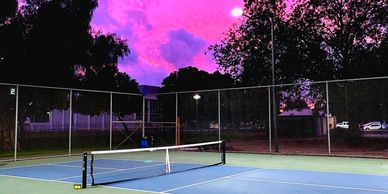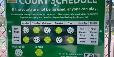 Four permanent courts, two dual use courts, all have lights until 9pm. Paddle saddle used for rotation. Open play every morning and evening. Use paddle saddle when courts are full, rotate 4 off and 4 on. Challenge Court has its own paddle saddle and must have challengers or the court goes into into the general rotation.
